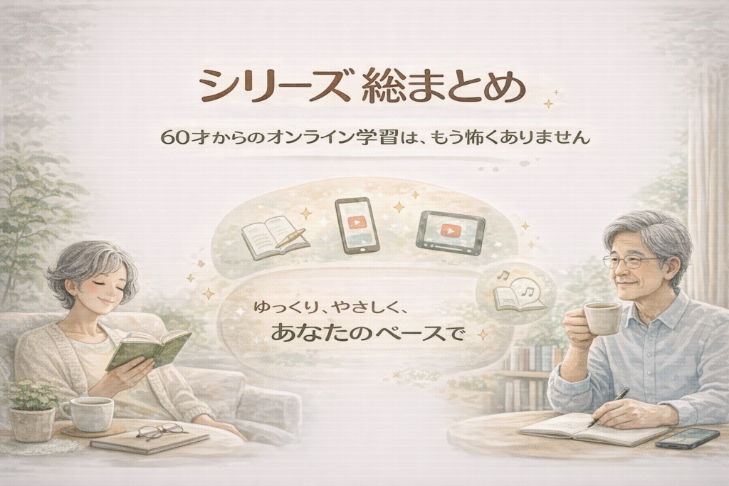 60才からのオンライン学習|ゆっくり、やさしく、あなたのペースで このシリーズでは、「60才からのオンライン学習」をテーマに、一歩ずつ、やさしく考えてきました。 はじめは、不安から始まりました。 今さら遅いのではないか パソコンが苦手 続かないの... -
